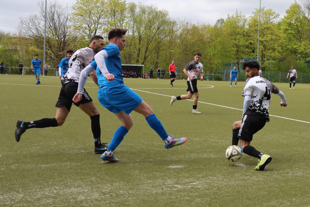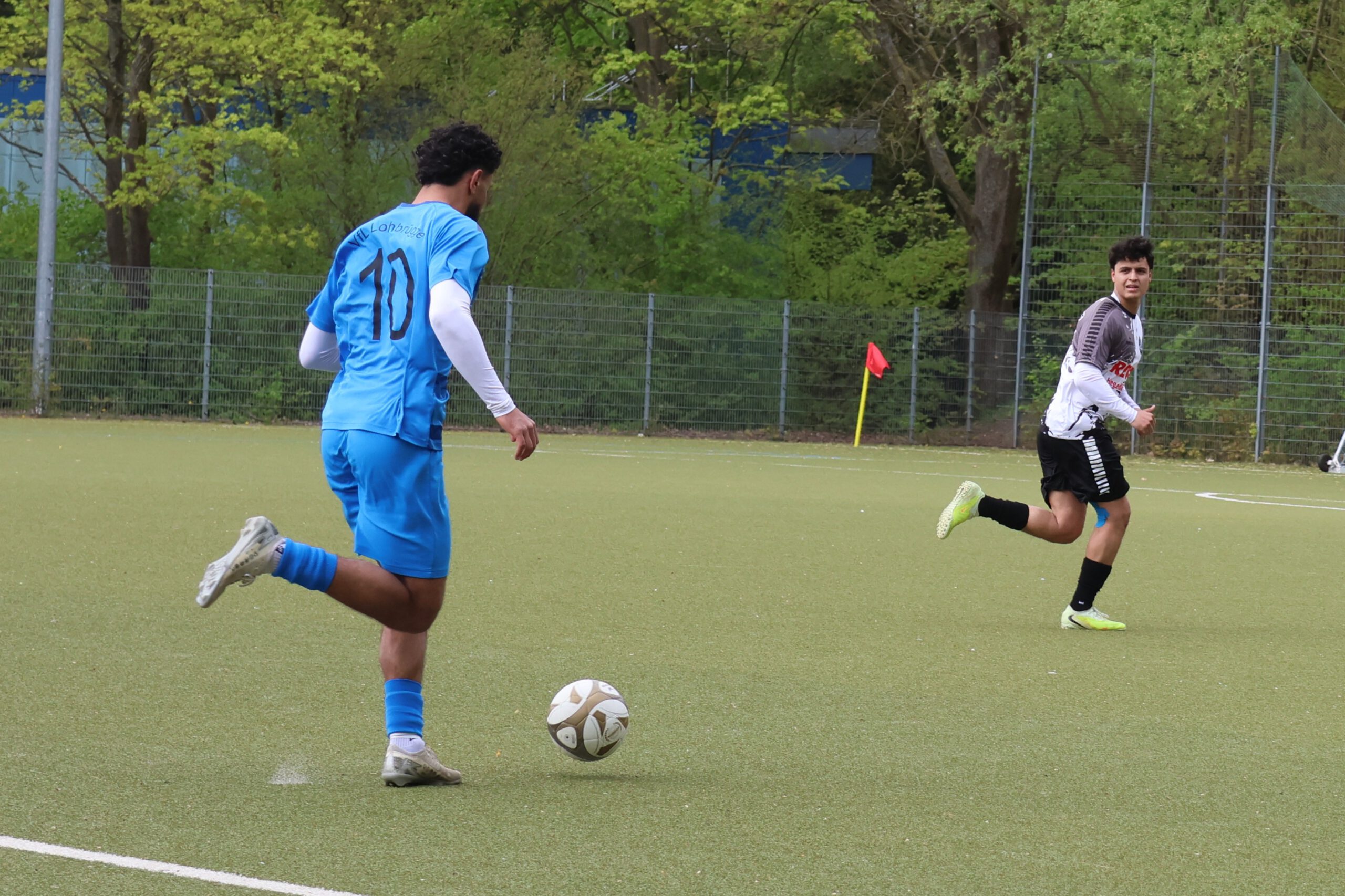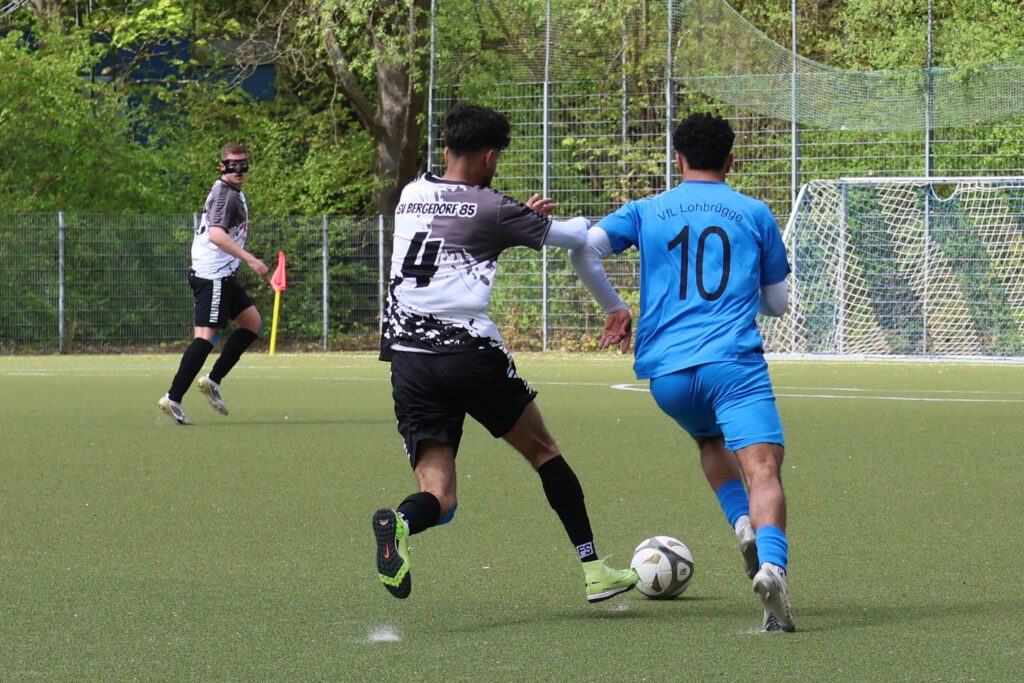 Unser Team setzte die Gastgeber gleich unter Druck, aber auch die versteckten sich nicht und suchten mit schnellen Gegenstößen den Erfolg. Nach 20 Minuten bekam unsere Mannschaft einen Eckball zugesprochen, weil der Lohbrügger Keeper den Ball zu lange in den Händen gehalten hatte. Diese brachte aber nichts ein. Auch die folgenden Torschüsse von Ali Moghimi und Nick Turtun blieben erfolglos. Kurz vor der Pause war der Bann dann gebrochen. Aus dem Gewühl heraus setzte Nick Turtun das Leder knapp neben den Pfosten ins Gehäuse (0:1, 43.) . Wenig später konnten unsere Spieler einen Ball früh abfangen. Bryan Loureiro Pinto Ferro lief noch ein paar Schritte und hatte keine Mühe zu vollenden (0:2, 45.).